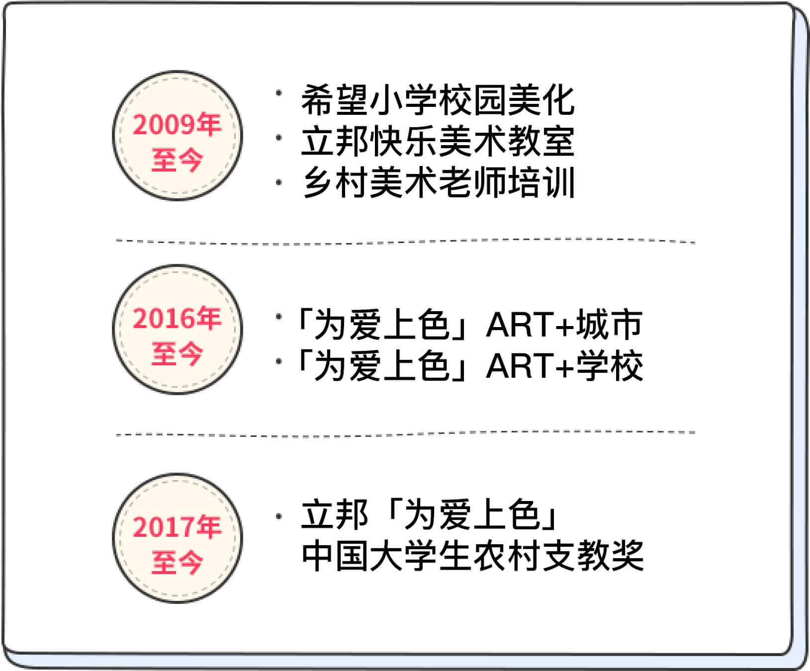 2009年,立邦與中國青少年發展基金會發起捐建立邦快樂美術教室項目,通過捐贈美術器材、組織鄉村美術教師培訓及 開展“美術作品征集令”活動等方式,完善美術教育資源,促進農村美術教育水平提升,提高青少年 感知美、理解美、創造美的能力。至2022年底,「為愛上色」已捐建390間快樂美術教室,讓更多偏遠地區學童受益。