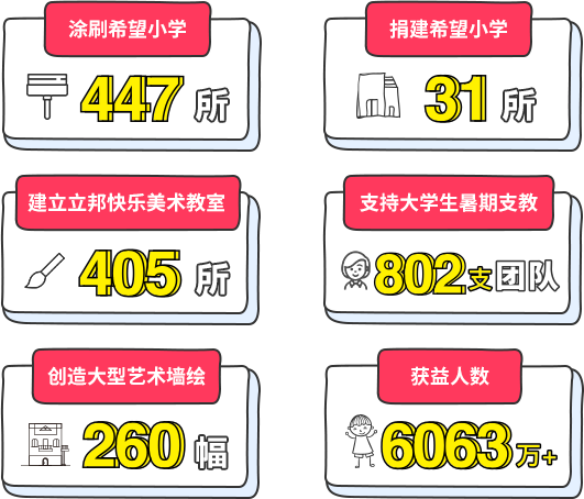 2009年至今,立邦「為愛上色」已覆蓋中國百余個城市、鄉鎮,完成超過 447 所美化校園工程,邀請國際藝術家開展「為愛上色」ART+項目以“兒童關懷”及“動物保護”為主題在學校及城市打造 260 幅大型藝術墻繪;捐贈 405 所快樂美術教室,開展美術老師培訓;近 802 支高校大學生團隊參與立邦「為愛上色」中國大學生支教獎,支持高校展開暑期支教及實踐;并獲得超過56家企業團體聯名支持,近 6063 萬+人獲益。